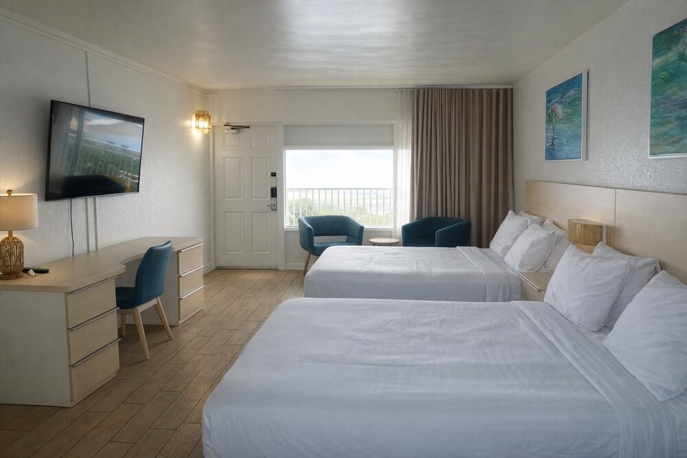 Direct oceanfront room with private patio on the ground floor and private balcony on the upper floor, One Beauty rest King Bed, One Beauty rest Queen Bed, 43" Flat Screen HD TV, Kitchen with induction stove top, microwave, full fridge, coffee maker, crockery, glasses, cutlery and dining table. Sleeper couch on ground floor instead of queen bed.